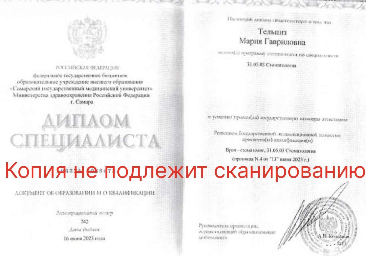 Образование и квалификация: · 2023 - Диплом специалиста по специальности «Врач-стоматолог», СамГМУ. Основные направления работы: · Профессиональная гигиена: бережное удаление зубного камня и налёта для идеальной чистоты. · Эффективная профилактика: защита от кариеса и заболеваний десен. · Персональное обучение: подбор средств и составление индивидуального плана домашнего ухода. · Укрепление эмали: процедуры герметизации фиссур и реминерализации для долгосрочной защиты. Почему пациенты выбирают Марию Гавриловну: ● Комфорт и безопасность превыше всего. Она проводит бережную чистку, которая не просто очищает, а сохраняет естественную белизну и здоровье эмали. ● Профилактика по индивидуальному плану. Организует уход так, чтобы предупредить проблемы, а не бороться с последствиями. ● Обучение, а не общие советы. Подбирает средства гигиены и технику чистки, которые подходят именно вам, и учит, как правильно их применять. ● Доверительная атмосфера. Создаёт условия, в которых легко говорить о страхах и ожиданиях, делая каждый визит психологически комфортным.
